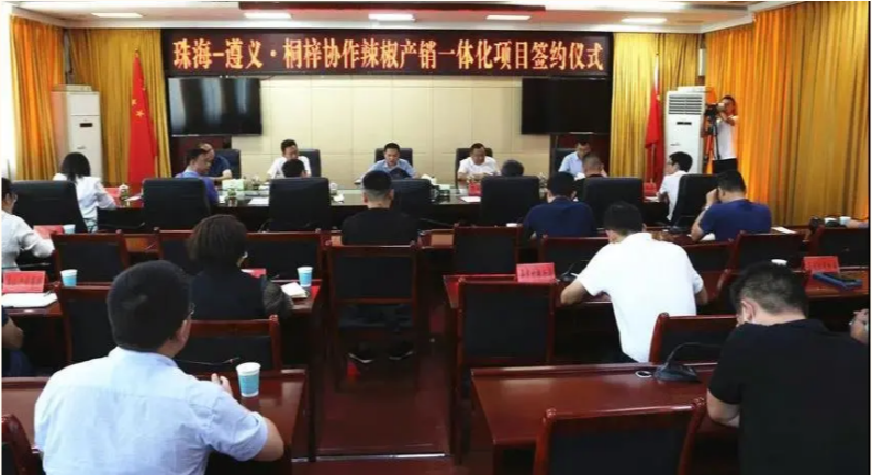 近日,“珠海-遵義· 桐梓協(xié)作辣椒產(chǎn)銷(xiāo)一體化項(xiàng)目”簽約儀式在桐梓縣政府舉行。桐梓縣人民政府、珠海市菜籃子投資有限公司、辣妹子食品股份有限公司、遵義辣椒產(chǎn)業(yè)集團(tuán)有限公司簽訂了四方合作協(xié)議,共同打造辣椒產(chǎn)銷(xiāo)一體化產(chǎn)業(yè)。珠海農(nóng)控集團(tuán)黨委副書(shū)記劉國(guó)濤同志出席簽約儀式。